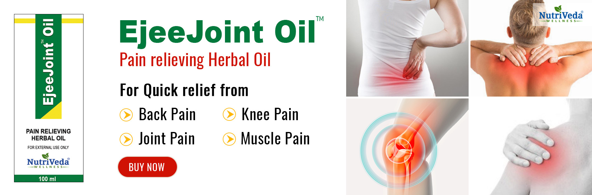 EjeeJoint Oil is a natural, scientific formulated product that offers fast & effective relief to Joint & muscular aches and pains in the Body. Simply apply the Oil to areas of discomfort for fast relief.The active ingredients of EjeeJoint Oil like Nilgiri oil, Pine Oil and Gaultheria penetrate swiftly to the area of pain. After penetration, they stimulate circulation, reduces inflammation, relax stiffness & re-oxygenate tense painful tissues. And the result is relief of Pain. Its regular use provides long term relief from pain associated with arthritis and other similar ailments and makes Joints healthy.
